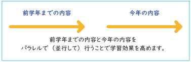 これから学校で習う基本的な内容を予習として、いま学校で習っている標準~応用内容を月例テスト対策として行います。