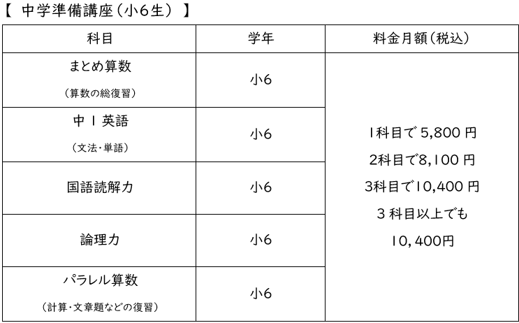 まとめ算数コース:1,200円 中1英語:2,000円 国語読解力 :3,650円 論理力コース:2,200円~(教材は相談の上選定します) パラレル算数:2,640~