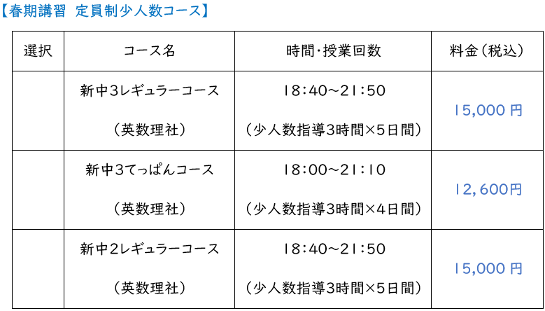 | 春期講習の受講には入塾が必要です(春期講習のみの受講はできません)。 |