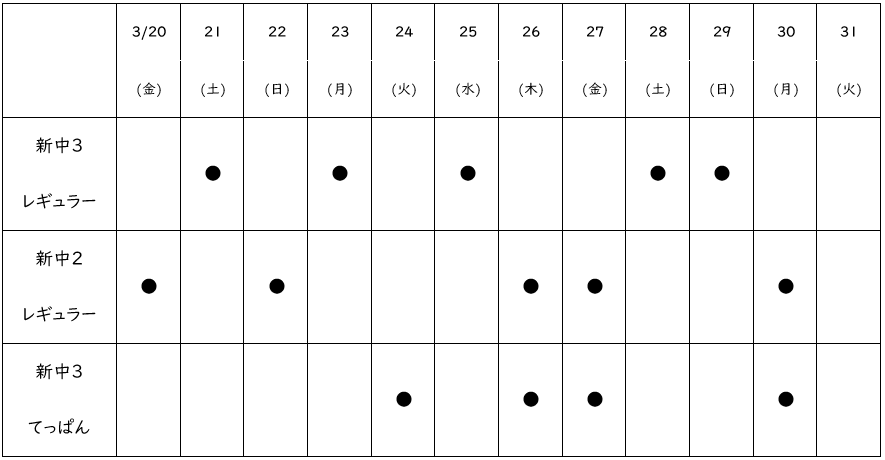 | 春休み中の演習量を増やすために特別補強(中学生のみ)をご活用ください。特別補強は下記の日程で行います。特別補強の参加には料金はかかりません。 |