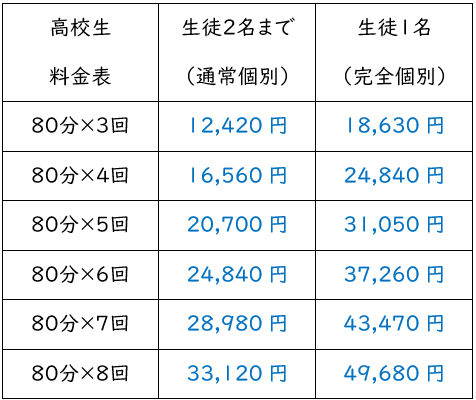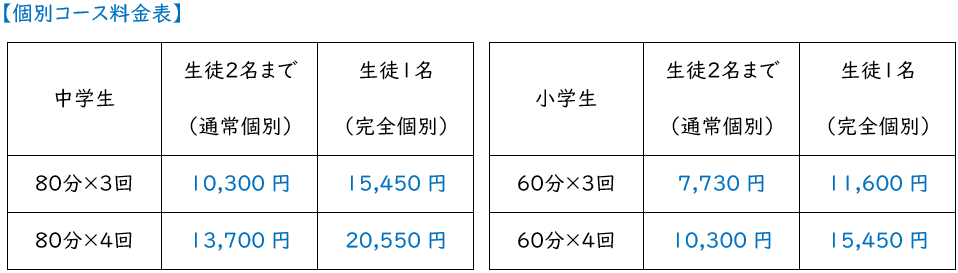 ■講師1名に対して生徒は2名までです。希望により完全個別コース(講師1名に対して生徒1名)にすることができます。