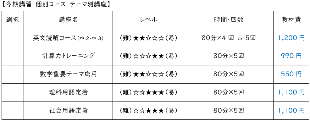 小学生・中学生・高校生の個別コース冬期講習は満席のため新規の受付を終了しました(現在の塾生のみで行います)。
