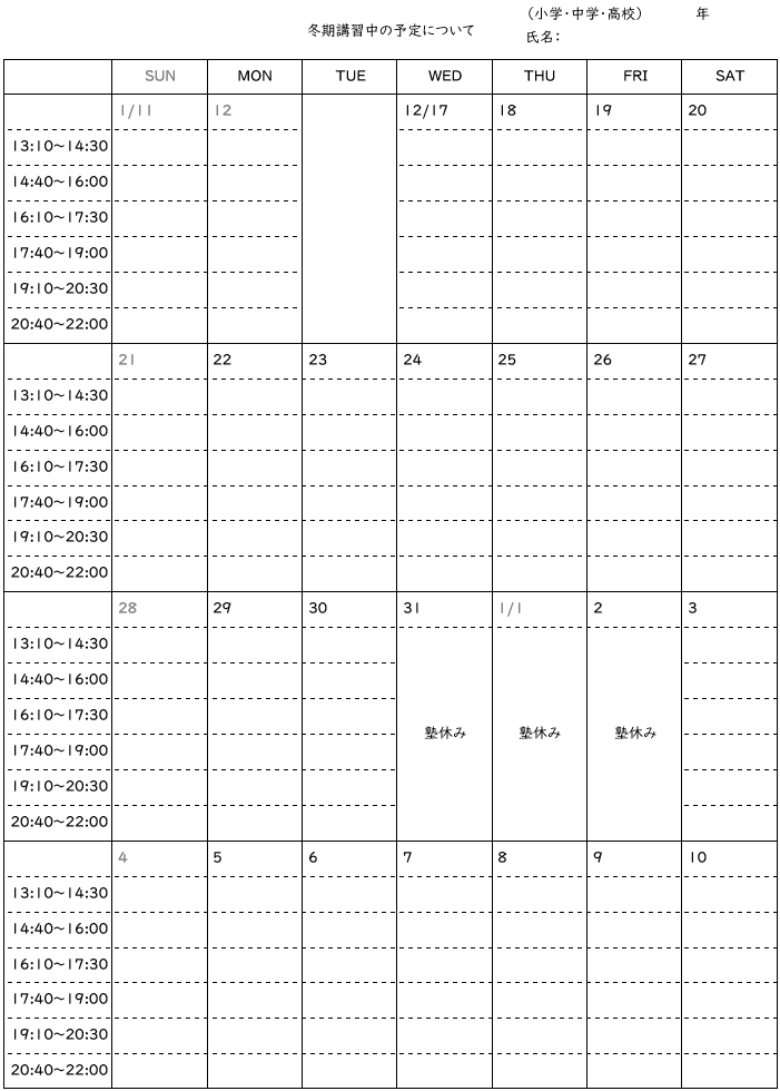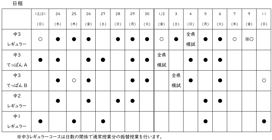 | 冬期講習期間中は、通常授業はお休みです。 |